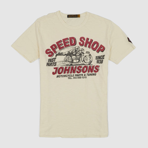 Johnson Motors Inc. Speed Shop Crew Neck Slub Yarn Cotton T-Shirts - naturalJohnson Motors Inc. Speed Shop Crew Neck Slub Yarn Cotton T-Shirts – natural
